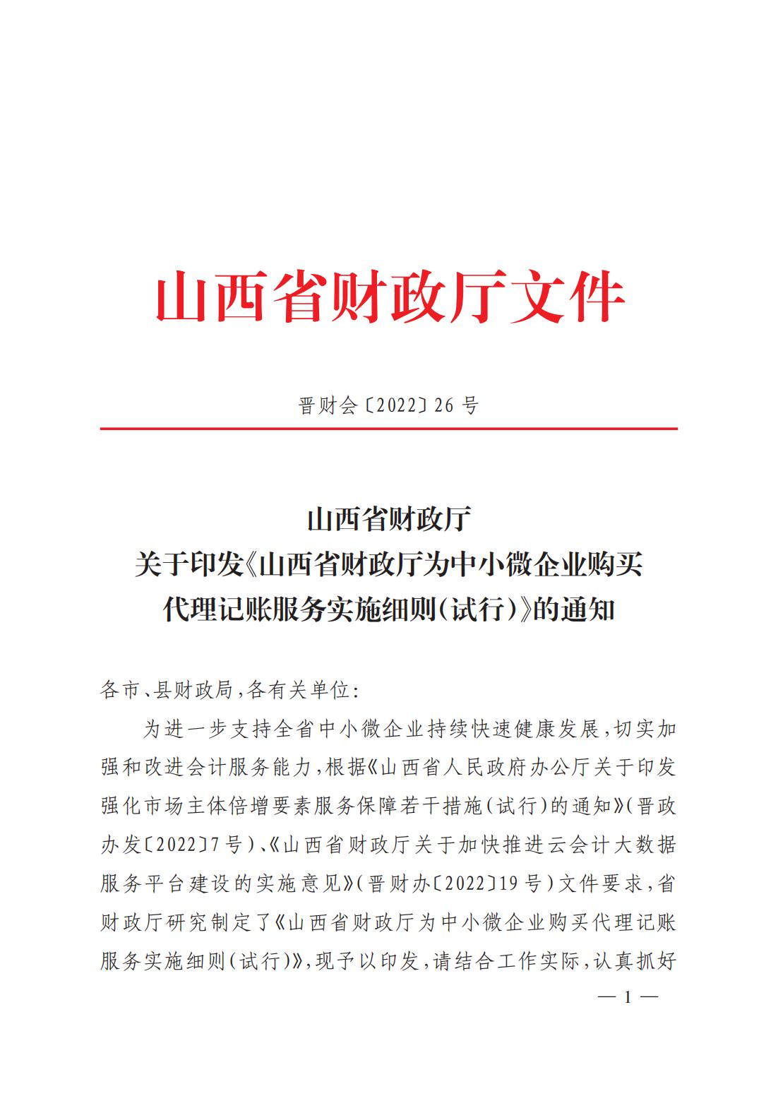 關(guān)于印發(fā)《山西省財政廳為中小微企業(yè)購買代理記賬服務(wù)實施細則(試行)》的通知